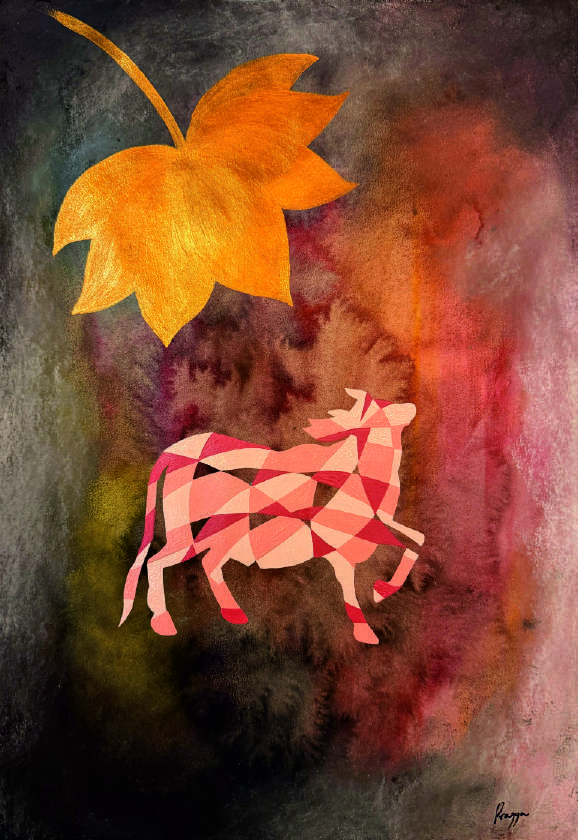 Nandi, the sacred bull and vehicle of Shiva, embodies devotion, fortitude, and patience. This series begins with an original painting printed on linen and elevated through meticulous hand embroidery—textures, contours, and fine thread work that echo my